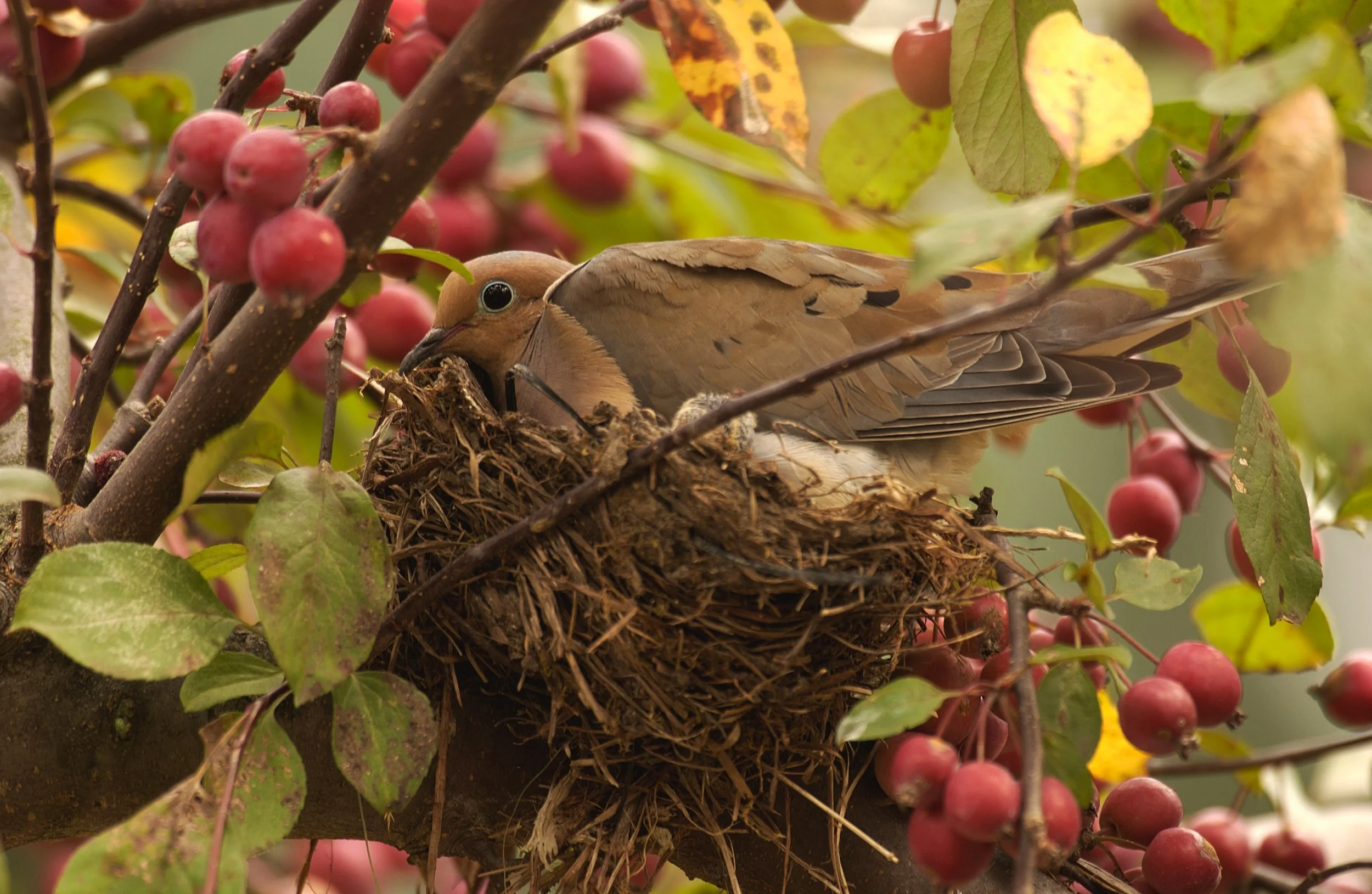 A mourning dove sits on a nest in a crabapple tree.