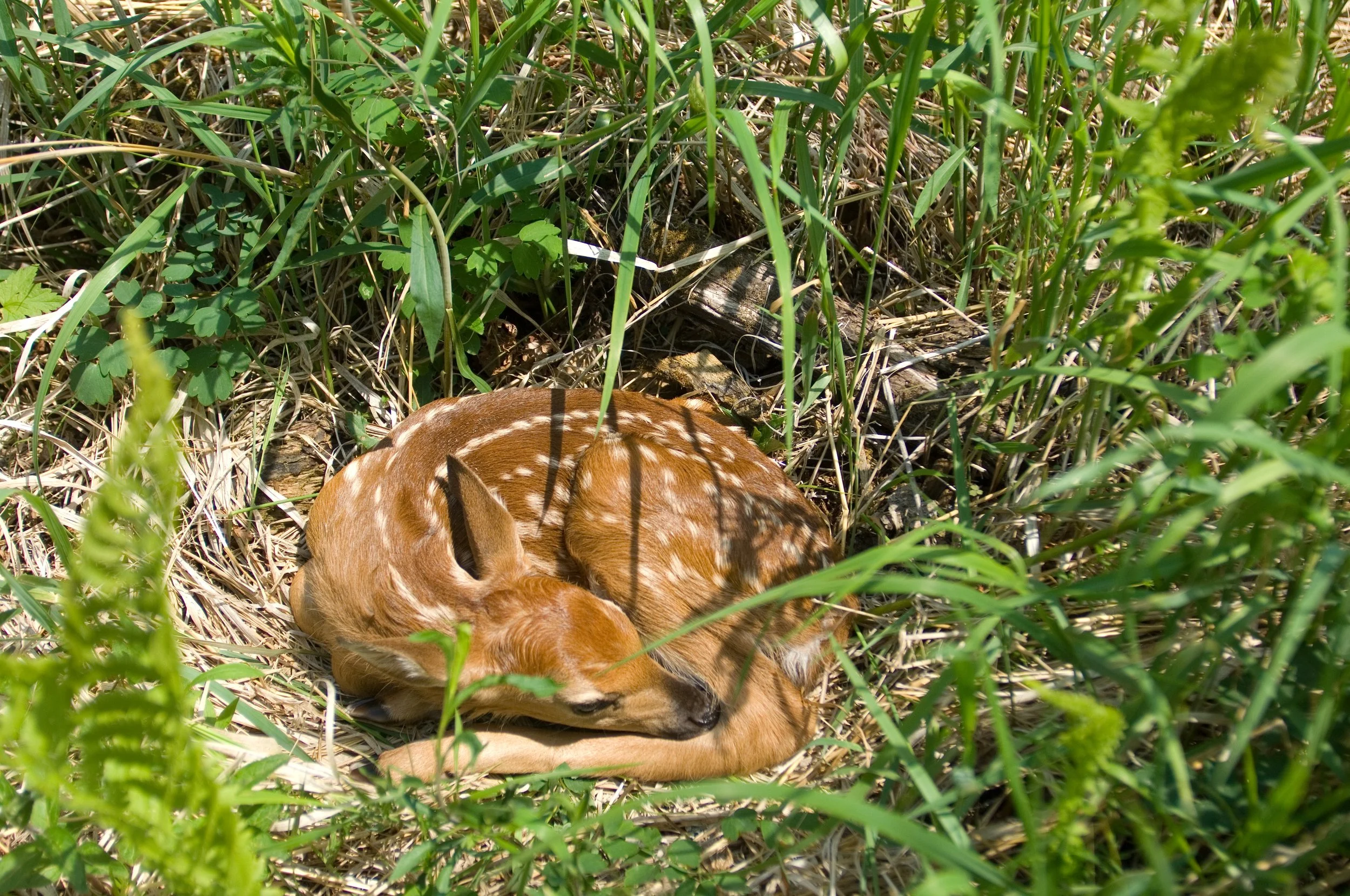 A spotted white-tailed fawn is curled up in a grassy nest, hidden by its mother for safekeeping. If you find a fawn like this, leave the area quickly so you don't leave your scent and expose the fawn to predators.