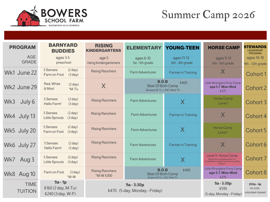 NOTE for B.O.B. Camp: Parents must drop their camper off and pick up from Bowers Farm on Mon.-Tues. and at Johnson Nature Center on Wed.-Thurs.