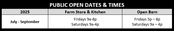 Our store and kitchen are open during Open Barn as well, with grab and go items such as ice cream, donuts, and seasonal meals.